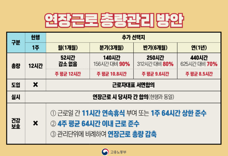 현재 유지되고 있는 1주 단위의 근로시간 제도는 70년간 유지되었던 것으로 이를 불합리하다고 보고 개선방안을 촉진한 것인데요. 일이 바쁠 경우 근로자가 52시간 이외에 더 일을 해도 사업주는 처벌을 피하기 위해 52시간만 일한 것으로 신고하는 경우도 많습니다. 정부는 기본 40시간에 연장 (최대) 12시간의 주 52시간 기본 틀은 유지하는 것으로 하고 주단위의 연장근로단위를 노사합의에 거쳐 월, 반기, 연 단위로 탄력적으로 운영할 수 있도록 하였습니다.