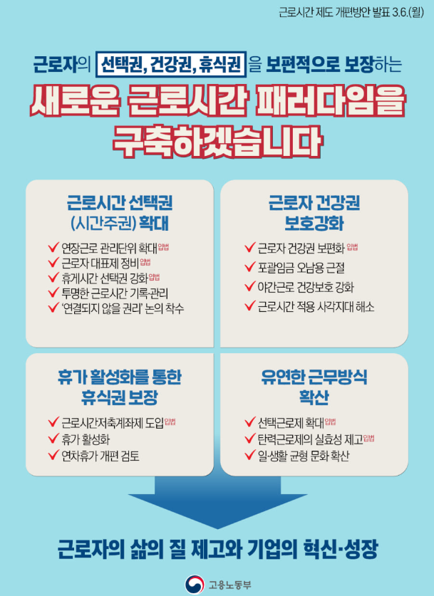 정부는 오늘부터 4월 17일까지 입법예고기간을 거친 후 돌아오는 6월~7월경 근로기준법과 다양한 관련법 개정안을 국회에 제출할 예정입니다.