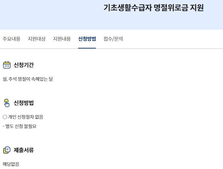 별도의 신청 절차가 따 로없으며 설 추석 등의 명절이 속해 있는 달에 지원됩니다.