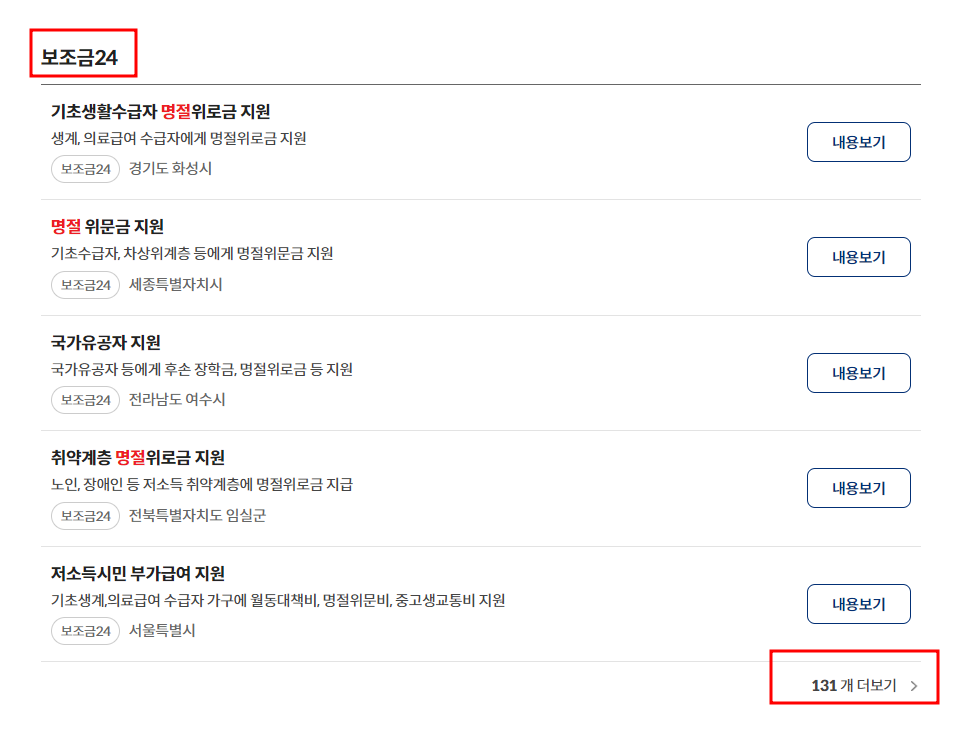 3. 검색 결과가 나오면 중간의 보조금 24 부분으로 들어가 아래 131개 더 보기를 클릭