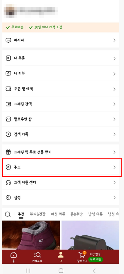 쇼핑을 하기 전에는 개인정보에서 쇼핑한 물건을 받을 주소를 설정해 주어야 합니다. 계정 생성 후 아래 부분을 보면 홈 카테고리 나 장바구니 등의 메뉴가 보이며 이중에 나를 선택하여 나오는 상세 메뉴 중 주소를 선택하면 됩니다